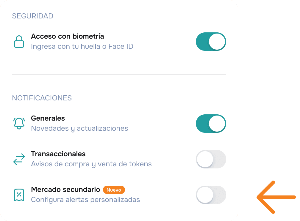 Ahora, cuando entres a Tu Cuenta → Ajustes de la App podrás ver, además de las notificaciones generales y de transacciones, la nueva sección de notificaciones del mercado secundario donde podrás activar la opción de recibir alertas de nuevas publicaciones de tokens que se ajusten a tus intereses.